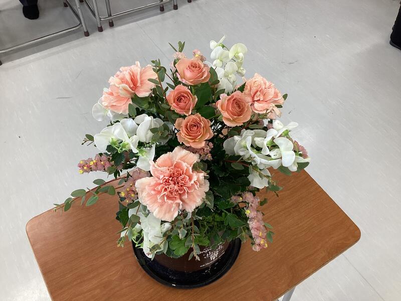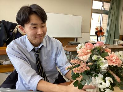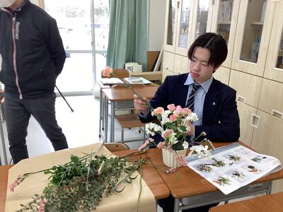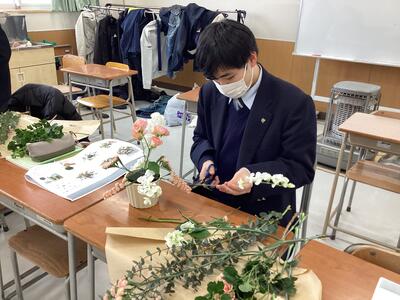 1月21日(水)「生物活用」の時間に、Flower Produce若柳店にご協力いただき、フラワーアレンジメントを教えていただきました。当日はバラやカーネーションを使い、花材の扱い方やアレンジする際のポイントなどを実践を交えながら学ぶことができました。参加した生徒たちは、和やかな雰囲気でそれぞれが個性あふれる作品を完成させることができました。