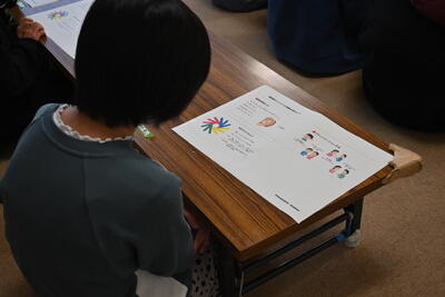 子どもたちは、聴覚障がいやデフリンピックについて学んだほか、「さんぽ」の曲を手話で歌う活動にも取り組みました。音楽を手話で表現する体験を通じて、障がいへの理解を深めるとともに、互いに楽しく交流する時間となりました。
